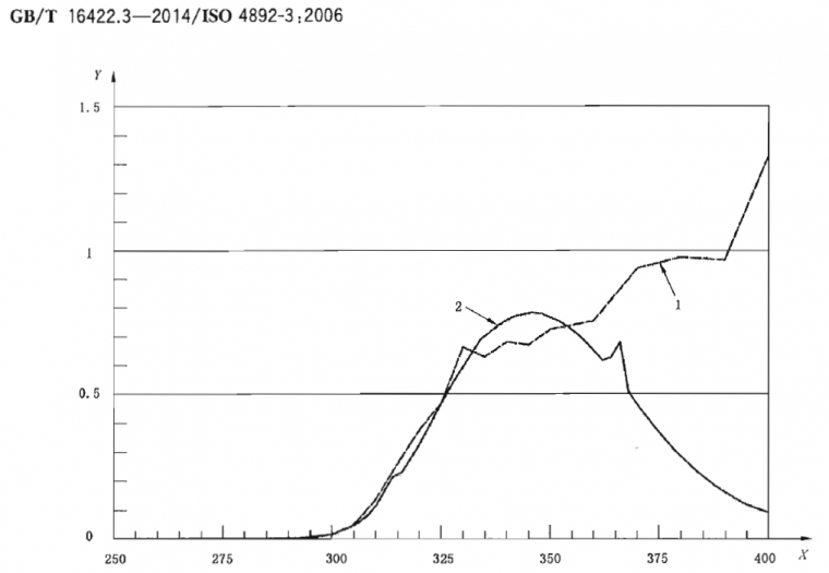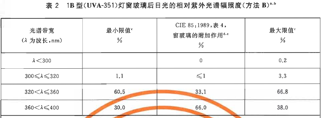 1B 型(UVA-351)熒光紫外燈:這種燈在300nm下的輻射低于總光能輸出的2%,在353nm有發(fā)射峰,用來模擬經(jīng)窗玻璃后日光的紫外部分,這種燈通常被稱秋UVA-351(見表2)。附錄A中的圖A.2為250nm~400nm下典型的1B型(UVA-351)熒光燈對比經(jīng)窗玻璃過濾后日光的光譜輻照度圖。2型(UVB-313)燈可在相關(guān)方協(xié)商同意下使用,但協(xié)商意見應(yīng)在試驗(yàn)報(bào)告中指出。