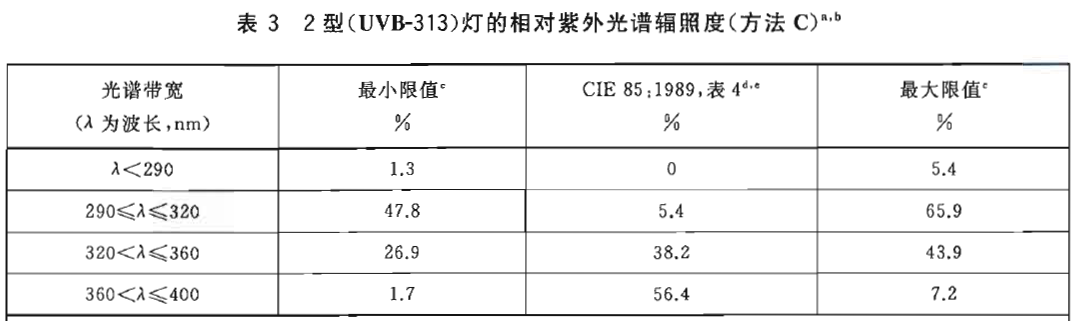 a 本表給出了在給定帶寬內(nèi)的輻照度占250nm~400nm總輻照度的百分比,要檢測一個(gè)典型的2型(UVB-313)燈是否符合本表要求,應(yīng)測量250nm~400nm的光譜輻照度。然后將每一帶寬內(nèi)的總輻照度加和,再除以250nm~400nm間的總輻照度。